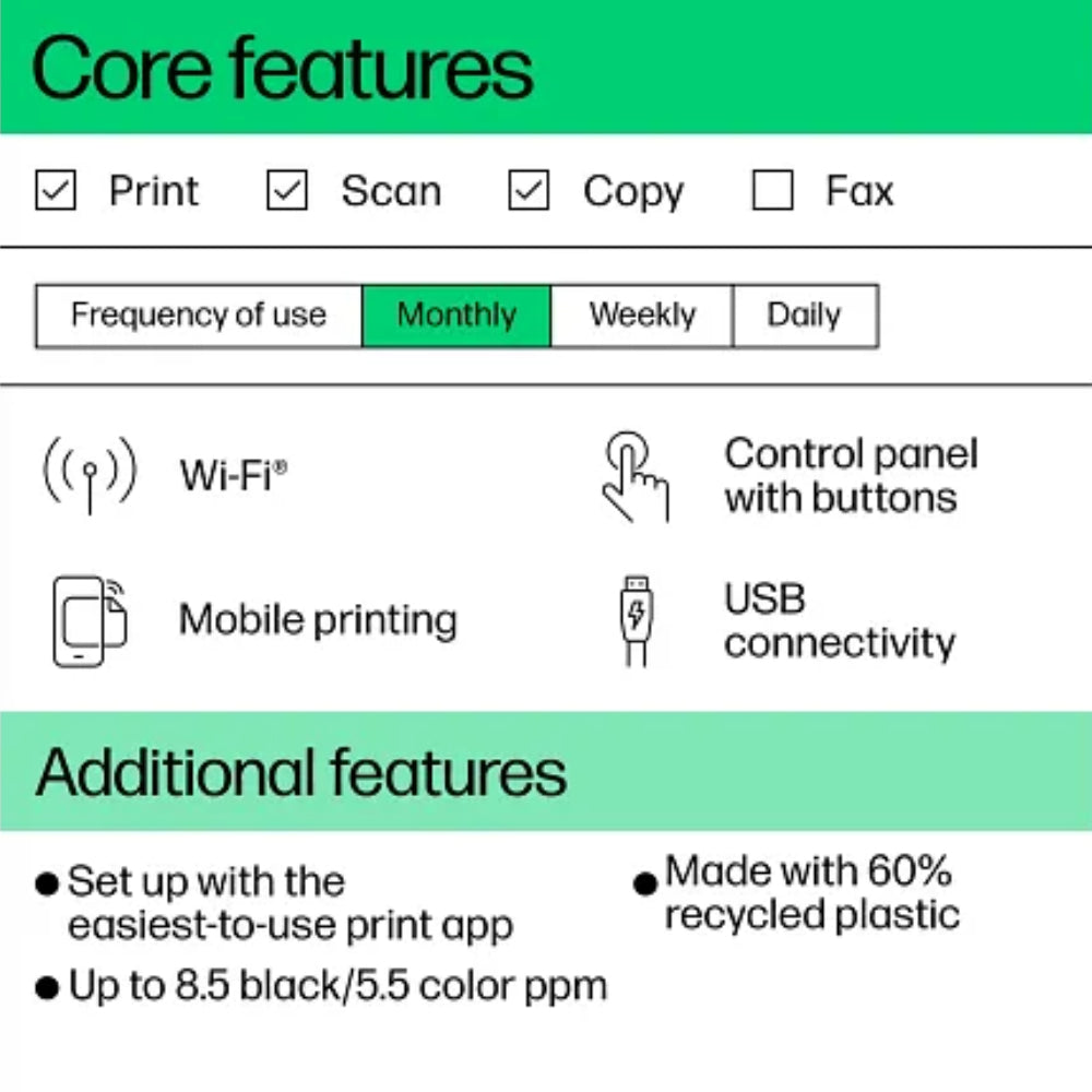 • Compact and wireless all-in-one functionality - print, scan, and copy with ease.
