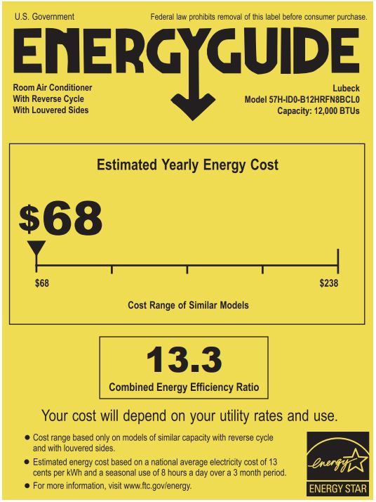 The Lubeck B12HRFN8BCL0 12,000 BTU Window Air Conditioner - White is designed to provide optimal comfort during those hot summer months. With its versatile 3-in-1 design, this unit functions as an air conditioner, fan, and dehumidifier, ensuring that you stay cool and comfortable regardless of the weather outside. Featuring three powerful fan speeds, you can easily customize your cooling experience to suit your preferences. The unit is equipped with user-friendly LED digital controls, and maintenance is simplified with a washable filter. Additionally, the energy saver switch helps to reduce energy consumption by cycling the fan on and off, while the advanced inverter compressor technology guarantees up to 35% energy savings. Enjoy lower electricity bills and a more eco-friendly cooling solution with this ENERGY STAR-rated window air conditioner.