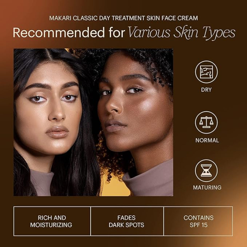 The Makari Day Radiance Anti-Aging and Brightening Face Cream 1.85 oz is your go-to solution for achieving a vibrant, youthful complexion. This luxurious face cream is expertly formulated to address dryness and dullness, ensuring your skin looks radiant and revitalized. With its fast-absorbing and rich moisturizing properties, this cream effectively fades dark spots while providing essential protection against sun damage. Perfect for dry, normal, and maturing skin types, it can be effortlessly integrated into your daily skincare routine. Simply apply a thin layer to your cleansed face and neck each morning, avoiding the eye area, for best results.