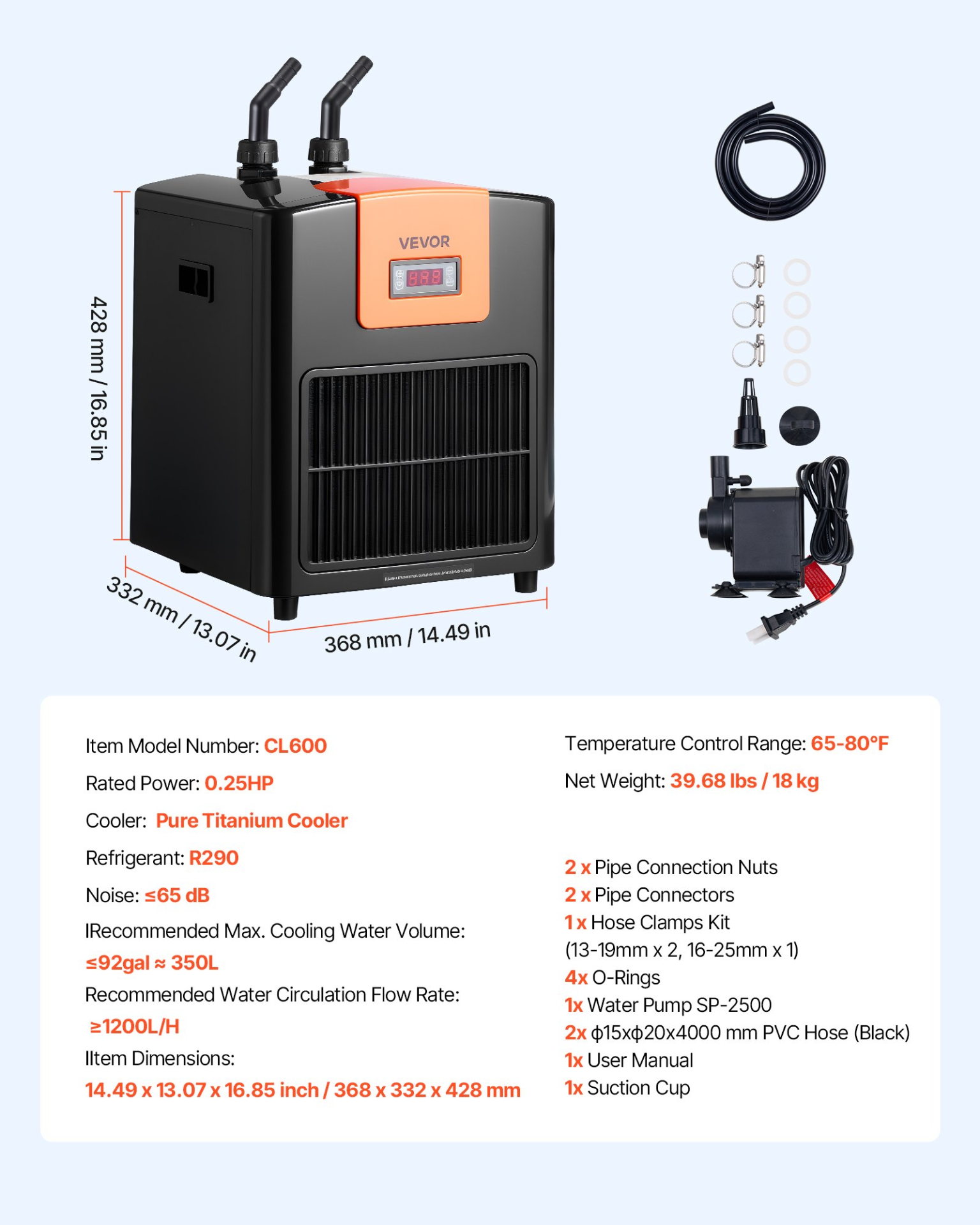 Recommended Max. Cooling Water Volume: β€92gal (approx. 350L),Cooler: Pure Titanium Cooler,Noise: β€65 dB,Refrigerant: R290,Item Model Number: CL600,Recommended Water Circulation Flow Rate: β₯1200L/H,Rated Power: 0.25HP,Item Dimensions: 14.49 x 13.07 x 16.85 inch / 368 x 332 x 428 mm,Temperature Control Range: 65-80β,Net Weight: 39.68 lbs / 18 kg,Main Material: PP + ABS Plastic