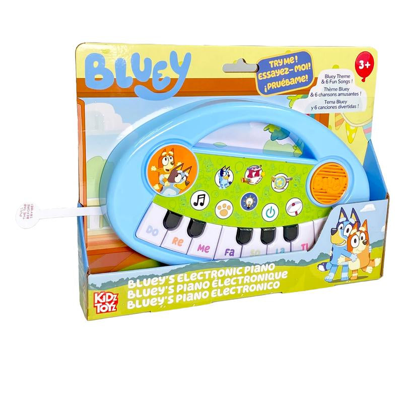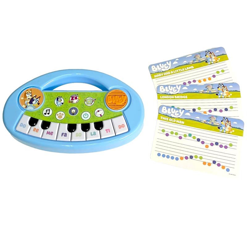 Tap into the musical genius of your little ones with the Bluey Music Time Band Electronic Keyboard! This one-octave musical wonder comes pre-loaded with Licensed Bluey's theme songs and a selection of timeless tunes, perfect for kids aged 18 months and up. Spark a lifetime love for music as they explore different instruments and melodies, all powered by the included AAA batteries. Features Officially Licensed Bluey product, capturing the charm and fun of the beloved show. A perfect size for tiny hands, making it easy for kids to explore musical concepts, while encouraging cognitive development, hand-eye coordination, and auditory skills through play.