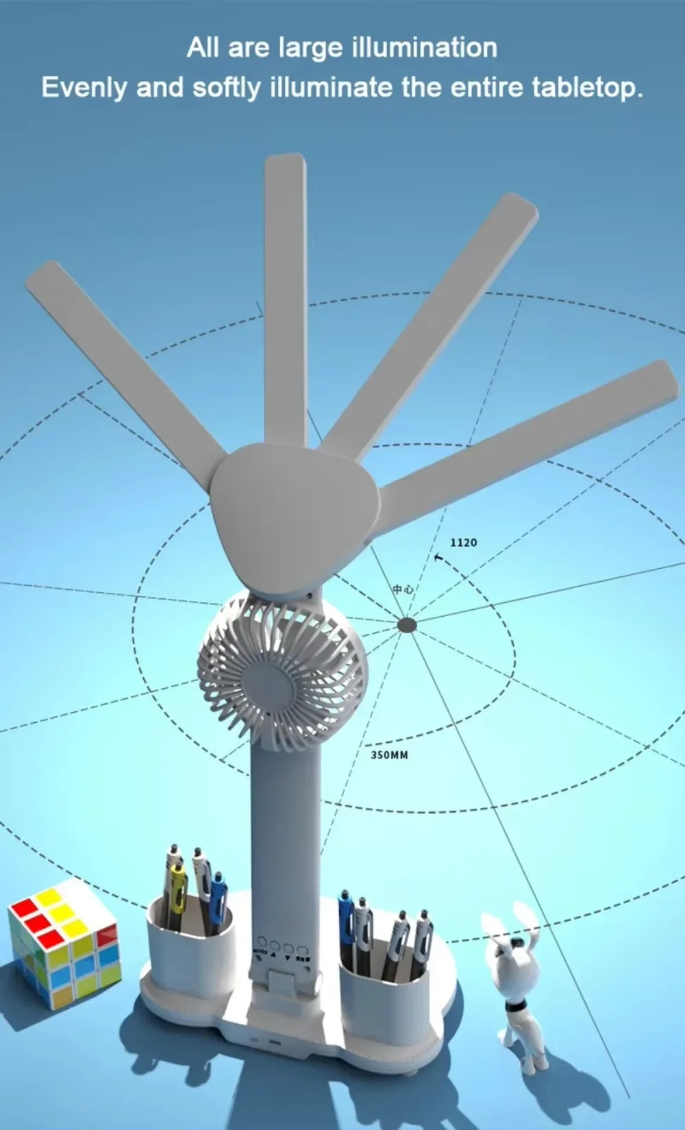 Multifunctional 3 Color LED Desk Lamp with Clock Fan and USB Charging Four Headed Folding Design