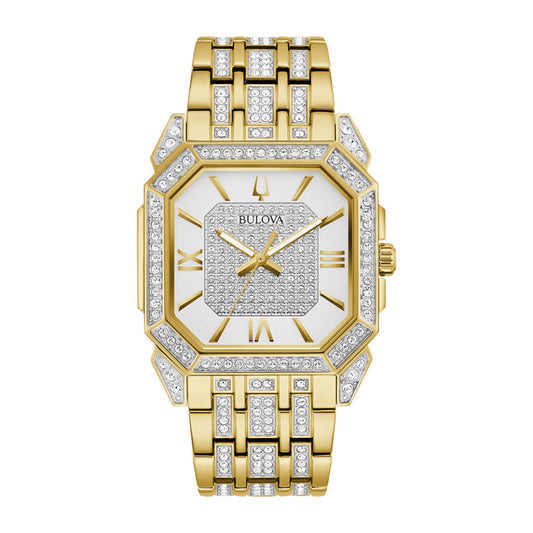 Elevate your style with the timeless elegance of this Bulova women's automatic watch from the Sutton Collection. Featuring a refined 34.5mm stainless steel case and a domed sapphire crystal with anti-reflective coating, this watch effortlessly blends classic design with modern sophistication. A transparent caseback offers a view of the watch's inner workings and its 42-hour power reserve. Paired with a croc-textured leather strap and secured with a classic buckle closure, this 30m water-resistant timepiece is the perfect accessory for those who appreciate craftsmanship and style.