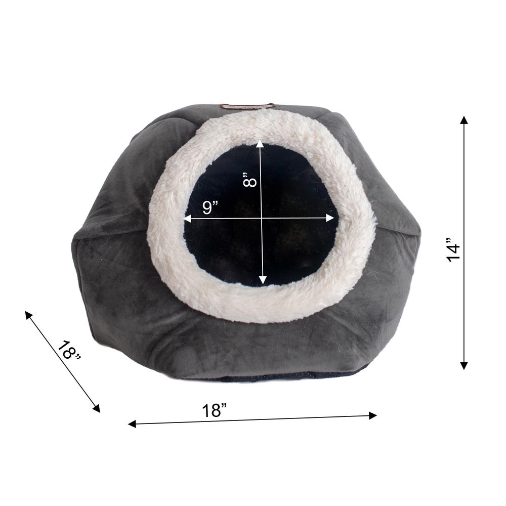 This ultra-soft velvet cat bed has a dark gray color and soft white plush trim. Overall Dimensions: 18"(L) x 18"(W) x 14"(H)Pad Thickness: 2.4" Snuggly hideout for pets that love to curl up and cuddle. Cat bed with dark gray and soft white color combo. Bed combines luxe velvet, soft plush, and flexible foam wall. Features a deep hiding space.
