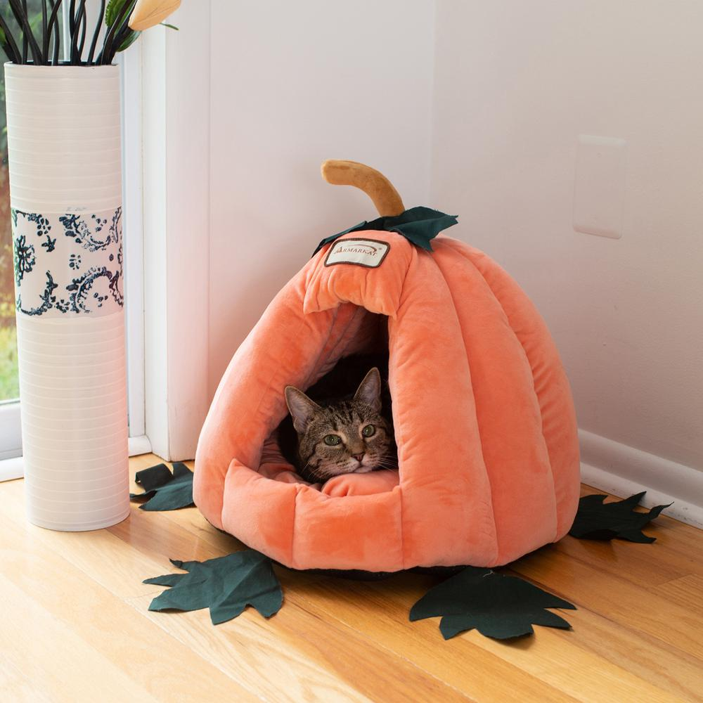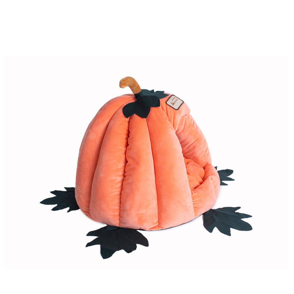 This plush cat bed is covered with luxe velvet for the ultimate in comfort. It is shaped like a pumpkin and is offered in orange. Overall Dimensions: 20"(L) x 20"(W) x 16"(H)Pad Thickness: 2.4" Pumpkin-shaped cozy cat bed. Covered in luxe velvet. Offered in orange. Water resistant and skid-free base