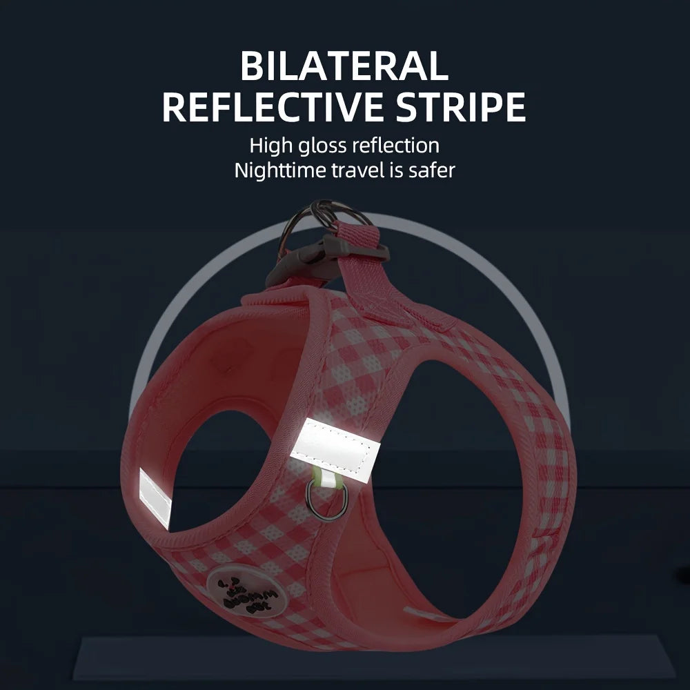 Festive Gingham Cat Harness: Breathable Polyester with Metal Clasps and Reflective Straps for Safe Walks