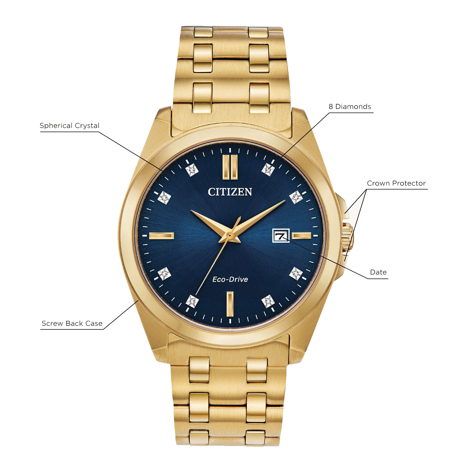 The Citizen Peyten Men's 41mm Eco-Drive Stainless Steel Bracelet Watch - Blue Dial is a masterful blend of elegance and functionality. Featuring a striking blue dial adorned with crystal accents, this timepiece is beautifully crafted in gold-tone stainless steel, making it a standout addition to any man's collection. The Eco-Drive technology harnesses light, eliminating the need for battery replacements, which means you can wear this watch with confidence knowing it will keep time accurately and effortlessly. With its water-resistant capabilities and durable construction, the Citizen Peyten is perfect for both formal occasions and everyday wear. Elevate your accessory game with this versatile timepiece that not only looks great but also embodies the spirit of innovation and style.
