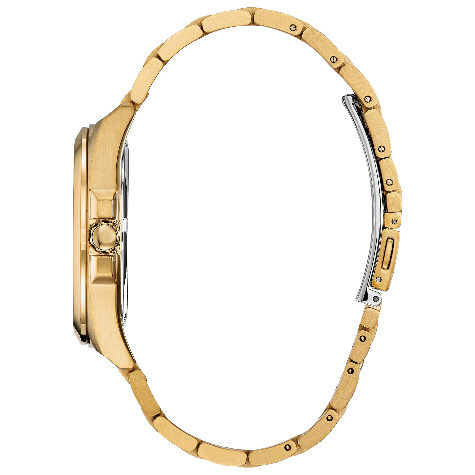 - Durable gold-tone stainless steel bracelet for comfort and style.