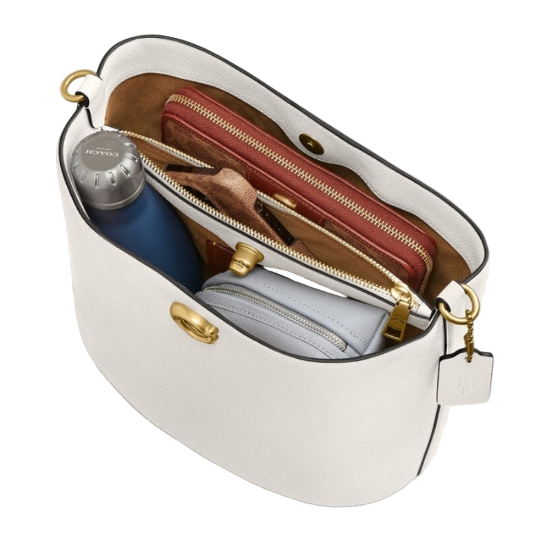 The Coach Willow Soft Bucket Bag is the perfect go-anywhere accessory, blending style, functionality, and craftsmanship. Made from polished pebble leather with a fabric-lined interior, this bucket bag features a turnlock closure, a center zip compartment, and an inside snap pocket for organized storage. Generously sized yet compact enough for daily use, it includes a detachable handle and strap, allowing it to be carried by hand, on the shoulder, or as a crossbody. Protective feet at the base enhance durability, while the streamlined design ensures a sophisticated, timeless look suitable for any occasion.