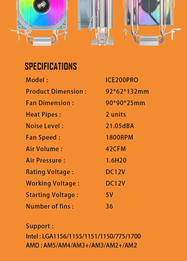 Elevate your system performance with the Aigo ICE200PRO Air CPU Cooler. Engineered for unbeatable cooling efficiency, this cooler features dual heatpipes that effectively draw heat away from your CPU, ensuring optimal temperatures during heavy gaming or demanding tasks. With a 3PIN PWM fan, this cooler operates at a whisper-quiet 21dBA, making it ideal for noise-sensitive environments. The sleek tower design not only maximizes airflow but also enhances the visual appeal of your build. Compatible with both Intel and AMD sockets, the Aigo ICE200PRO is the perfect choice for gamers, content creators, and PC enthusiasts looking for reliability and style in their cooling solution.