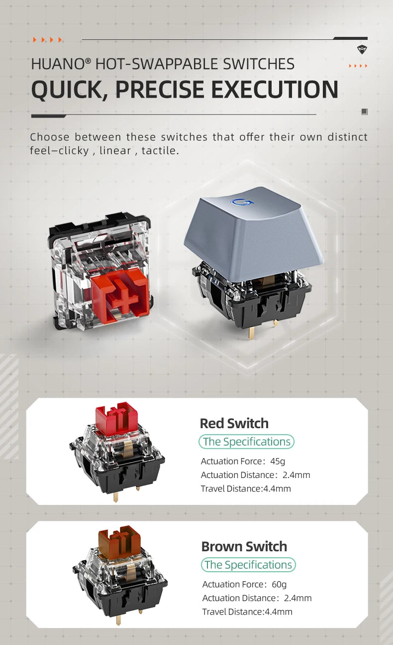 • Hot-Swappable Switches: Easily change out key switches without soldering for a fully customizable experience.