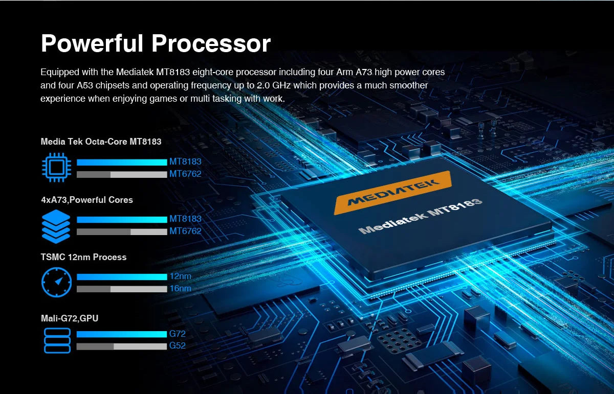 • High Performance: MTK8183 octa-core processor and 4GB RAM for fast and efficient multitasking.