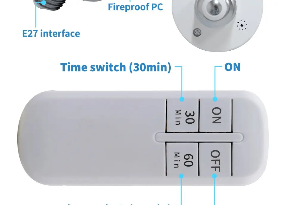 The Smart Timer Switch Wireless Remote Control E27 15m Range Lamp Holder is the ultimate lighting solution that merges convenience with innovation. This intelligent lamp holder allows you to manage your lighting effortlessly from the comfort of your couch or bed, making it an indispensable addition to your home or office. With a robust wireless range of 15 meters, you can easily control hard-to-reach fixtures. The built-in timer function ensures that your lights automatically turn off after 30 or 60 minutes, saving you energy and providing peace of mind. Compatible with both E26 and E27 bulbs, it offers flexibility in your lighting choices and helps create the perfect atmosphere in any space. Enjoy a seamless lighting experience with this intuitive and user-friendly lamp holder. Product Highlights. Easy Wireless Control: Operate your lights from anywhere within a 15m range using the included remote. Timed Lighting: Set your lights to turn off automatically after 30 or 60 minutes, providing energy savings and peace of mind. Universal Compatibility: Works seamlessly with both E26 and E27 light bulbs, allowing for diverse lighting options. No Additional Equipment Needed: No app, Wi-Fi, or hub required"”just plug in, and you're ready to go! Robust Build Quality: Designed with durability in mind, this lamp holder is made to last with high-quality materials.