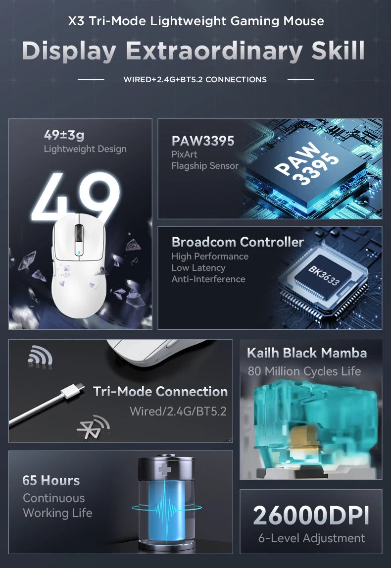 X3 PixArt PAW3395 Bluetooth Mouse 26000dpi Tri-Mode 49g