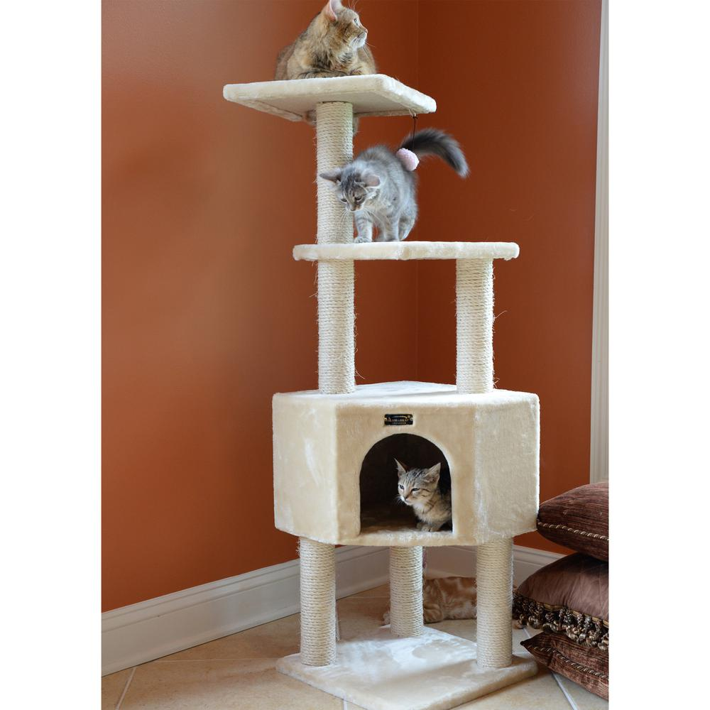 Cat Daddy Approved by noted cat behaviorist Jackson Galaxy. The cat tree is covered in beige faux fur. And well constructed of strong and sturdy pressed wood. Includes six sisal scratching posts. Include a hanging rope toy, perch, condo, three levels, and scratching posts made from 100% cured sisal for long-lasting scratchability. Maximum holding weight: 20 lbs, recommended for all cats and kittens 10 weeks or older Easy to assemble with step by step instruction and tools, Six months manufacturer’s warranty against defects. Replacement parts available from manufacturer.