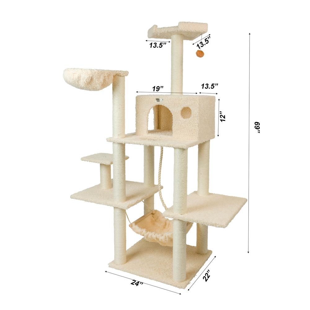 Cat Daddy Approved by noted cat behaviorist Jackson Galaxy. Features a swinging hammock, a playhouse, a lounging saucer, a thick 100% cured sisal rope toy and multiple perches and scratching posts for cats enjoyment. Multi level cat tower provide a spacious platform and condo for cats to play and relax. Well constructed of 15mm pressed wood material, making it not only thicker but stronger and keep it in shape. Easy to assemble with step by step instruction and tools