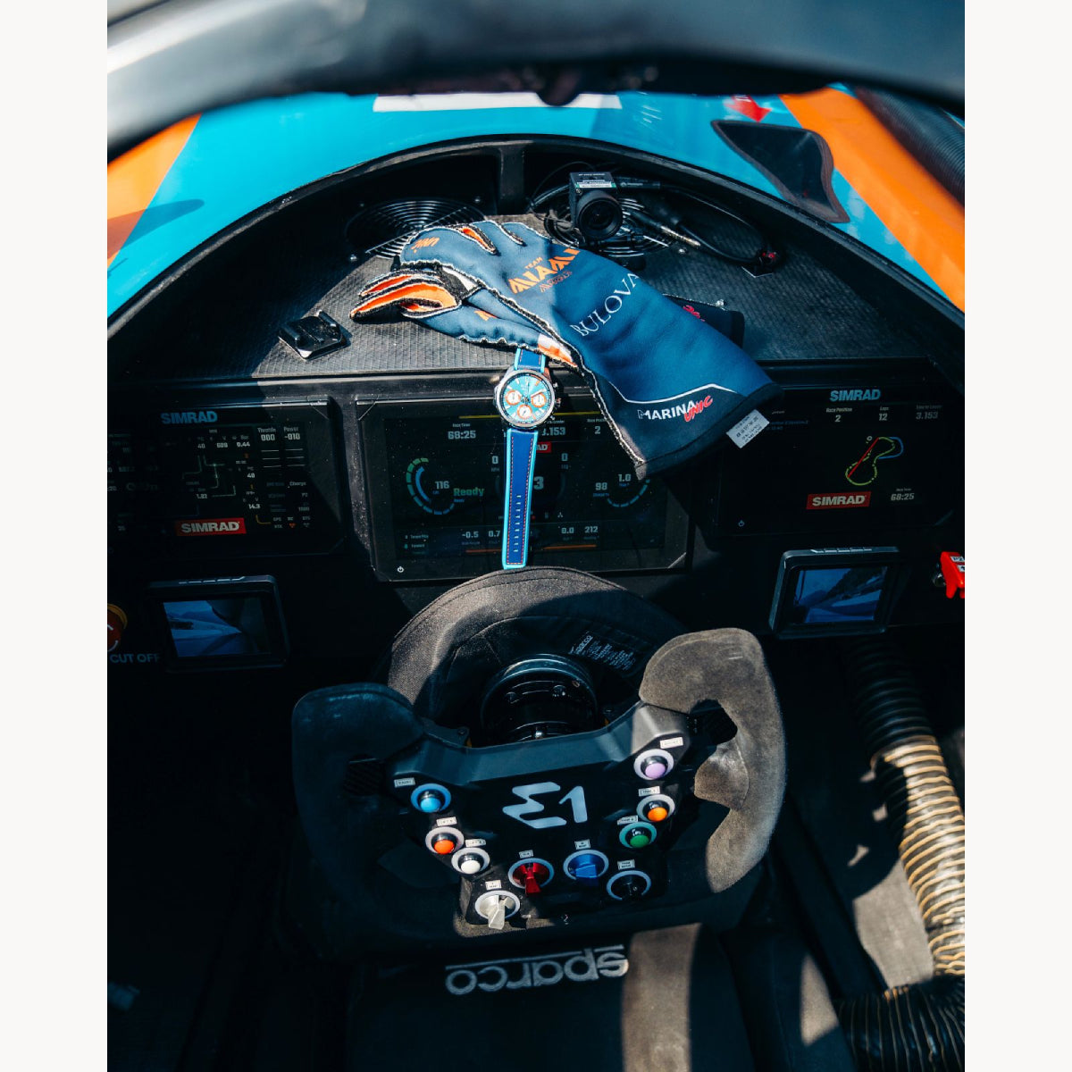 The Team Miami E1 Racing Marine Star B commemorates E1's Team Miami and the E1 Championship. The striking timepiece designed in the Team Miami E1 colors features a silver-tone stainless steel case with a flat sapphire crystal with anti-reflective coating and 100m of water resistance, a custom logo case back, and a leather and silicone rubber strap that coordinates with the dial. The blue dial has silver-tone applied markers and hands with Super-LumiNova luminescent fill, bright green accents, a date display, and orange and silver-tone subdials, including registers allowing timing to 1/20 of a second.