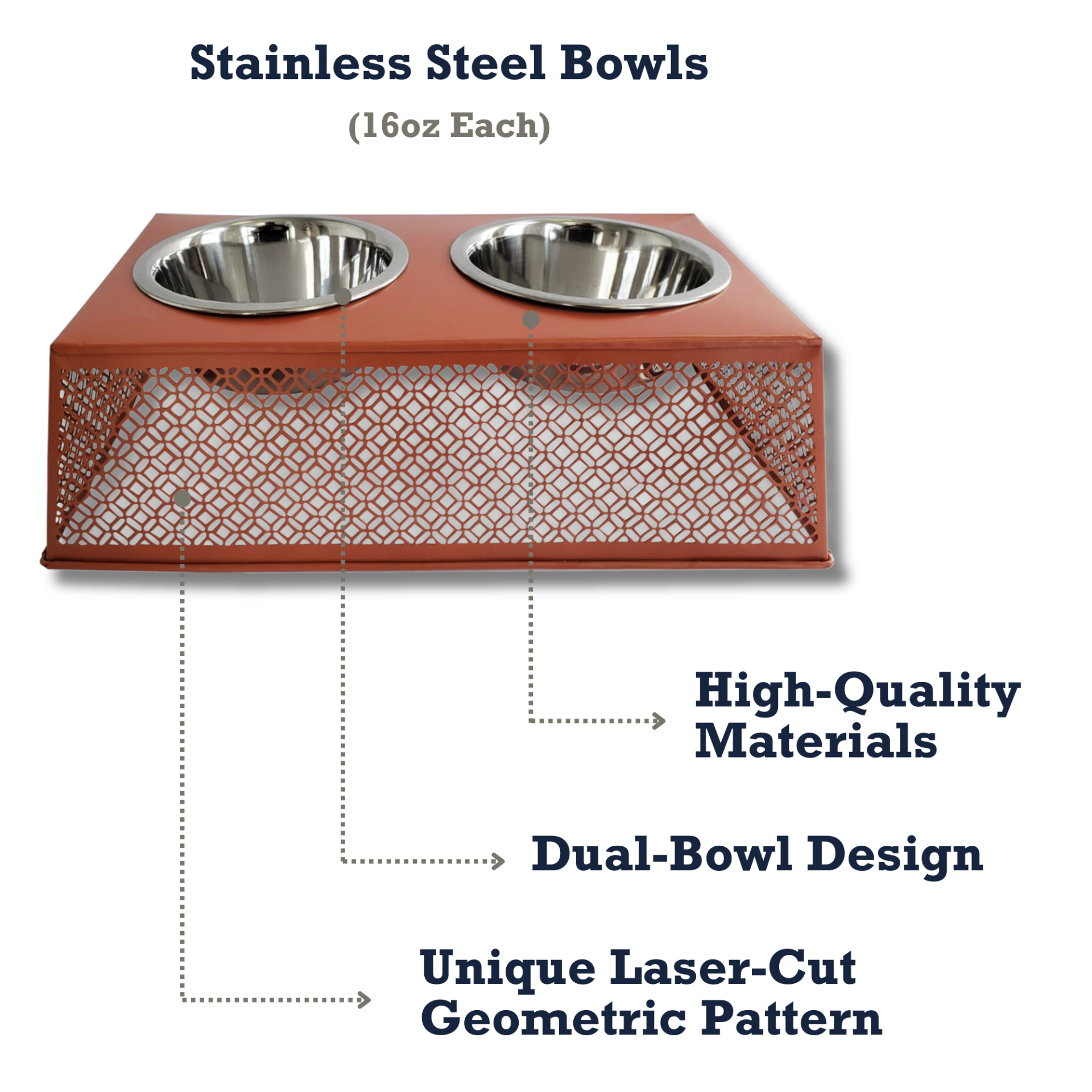 Equipped with two 16oz stainless steel bowls in a warm apricot brandy finish, it provides ample space for both food and water, ensuring a convenient and organized feeding experience. Crafted from durable and high-quality materials, this feeder is built for longevity while aligning with mindful values.