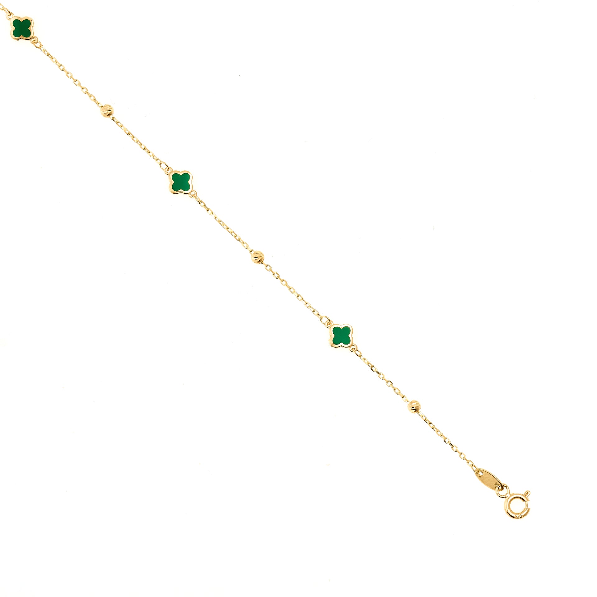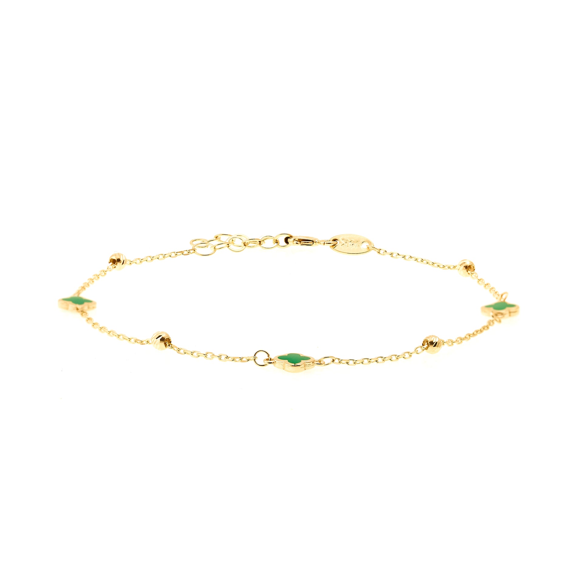 - 14K yellow gold bracelet designed with a vibrant green enamel clover charm