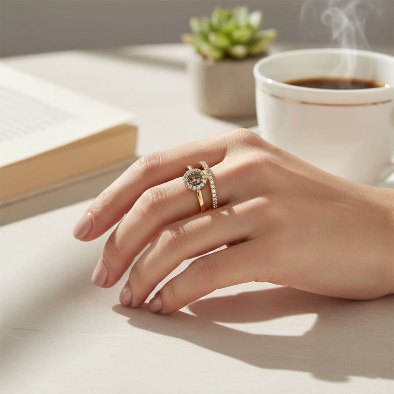 • Elegant halo design featuring a rich Chocolate Diamond with radiant Nude accents.