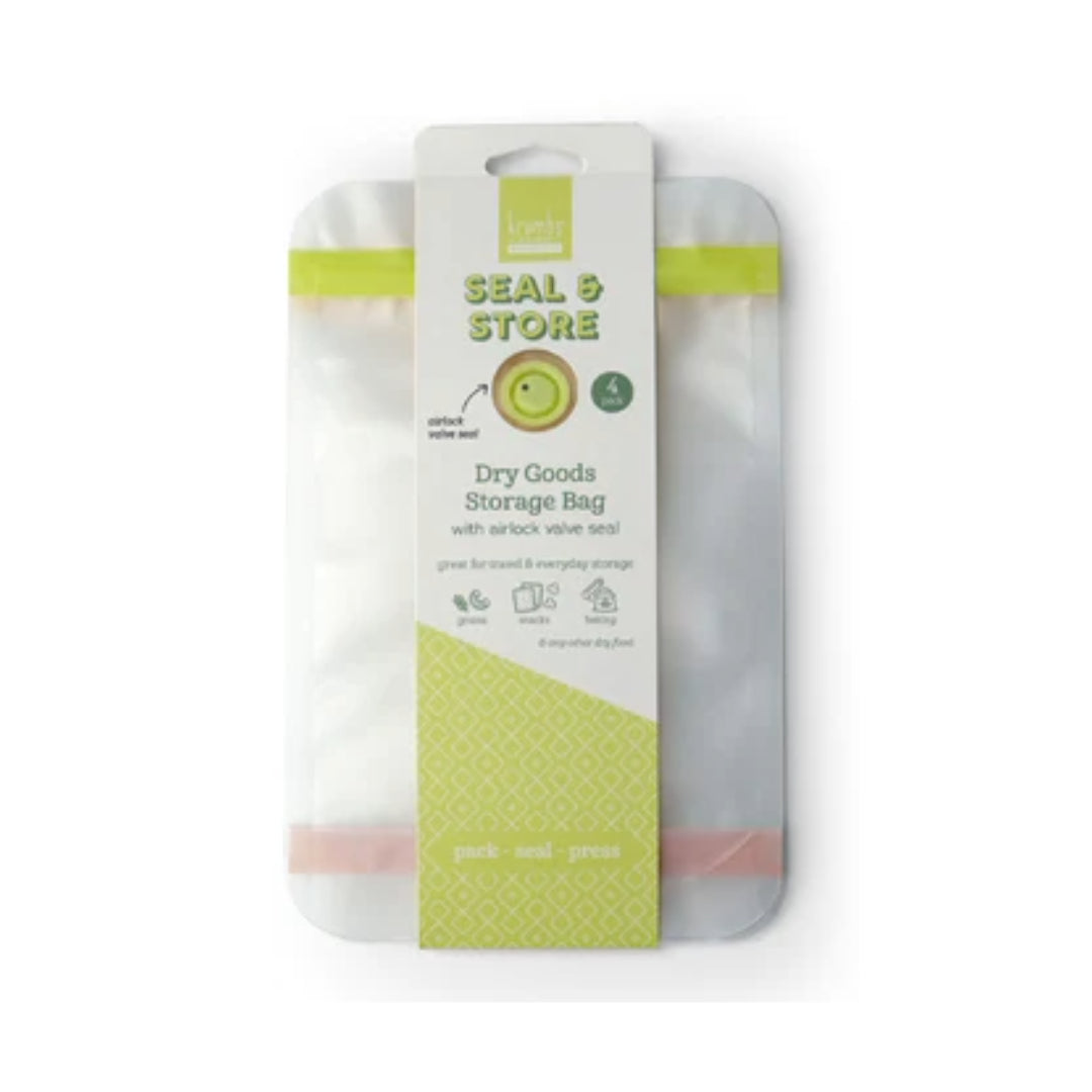The Krumbs Kitchen Essentials 4pk Dry Food Storage is the perfect solution for keeping your dry foods fresh and organized. This innovative set features reusable storage bags equipped with an airtight valve that allows you to squeeze out air, locking in freshness and flavor. Ideal for everything from grains to snacks, these storage bags come with colorful seals, making it easy to categorize and access your kitchen essentials. No more worrying about stale food or cluttered cabinets; with this 4-pack, you'll maximize your kitchen space while ensuring optimal food preservation.