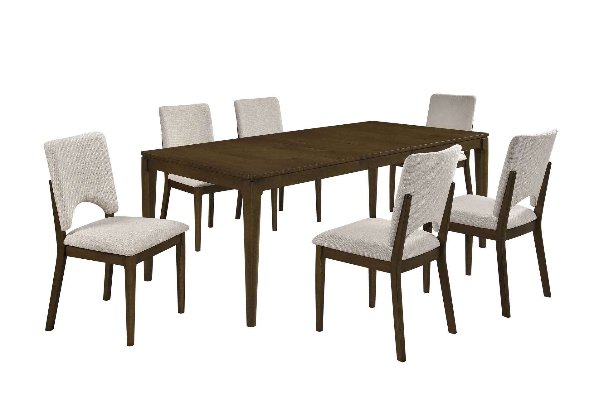 Drawing inspiration from rustic mountain lodges, the Windsor 7PCS Dining Set by Homelegance combines warm tones with a blend of transitional and modern design for a cozy, inviting feel. The Windsor Traditional Dark Brown Expandable Dining Table is crafted from sturdy rubberwood with bitter wood veneers, showcasing a rich dark brown finish that balances elegance and durability. Its expandable leaf comfortably seats up to eight, perfect for family dinners or entertaining guests. The Windsor dining chair pairs effortlessly with any table, featuring clean lines, a neutral finish, and a cushioned seat upholstered in light linen that complements the slightly distressed brown rubberwood frame. Adjustable floor levelers provide added stability on uneven surfaces.