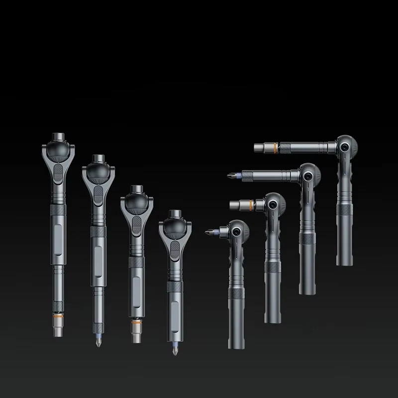 This is a detachable ratchet screwdriver handle made from a strong aluminum alloy, perfect for use in confined areas. It is constructed from a highly durable hot-forged aluminum alloy using precise CNC techniques, ensuring it is resistant to oxidation. Its hardness is comparable to that of regular steel, but it is only half the weight. The handle is designed for comfort, allowing for extended use without causing fatigue.