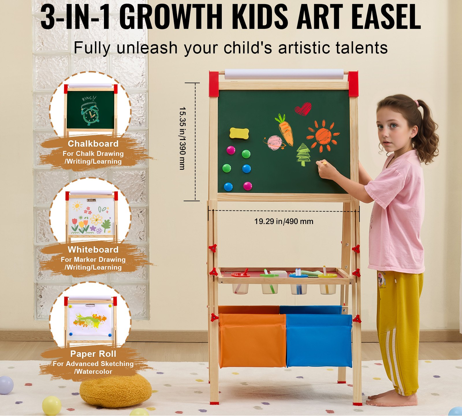 Art Easel for Kids, 3-in-1 Wooden Double-Sided Kid's Art Easel with Magnetic Whiteboard, Chalkboard, Paper Roll, Adjustable Standing Drawing Board with Painting Accessories, Storage for Boy Girl