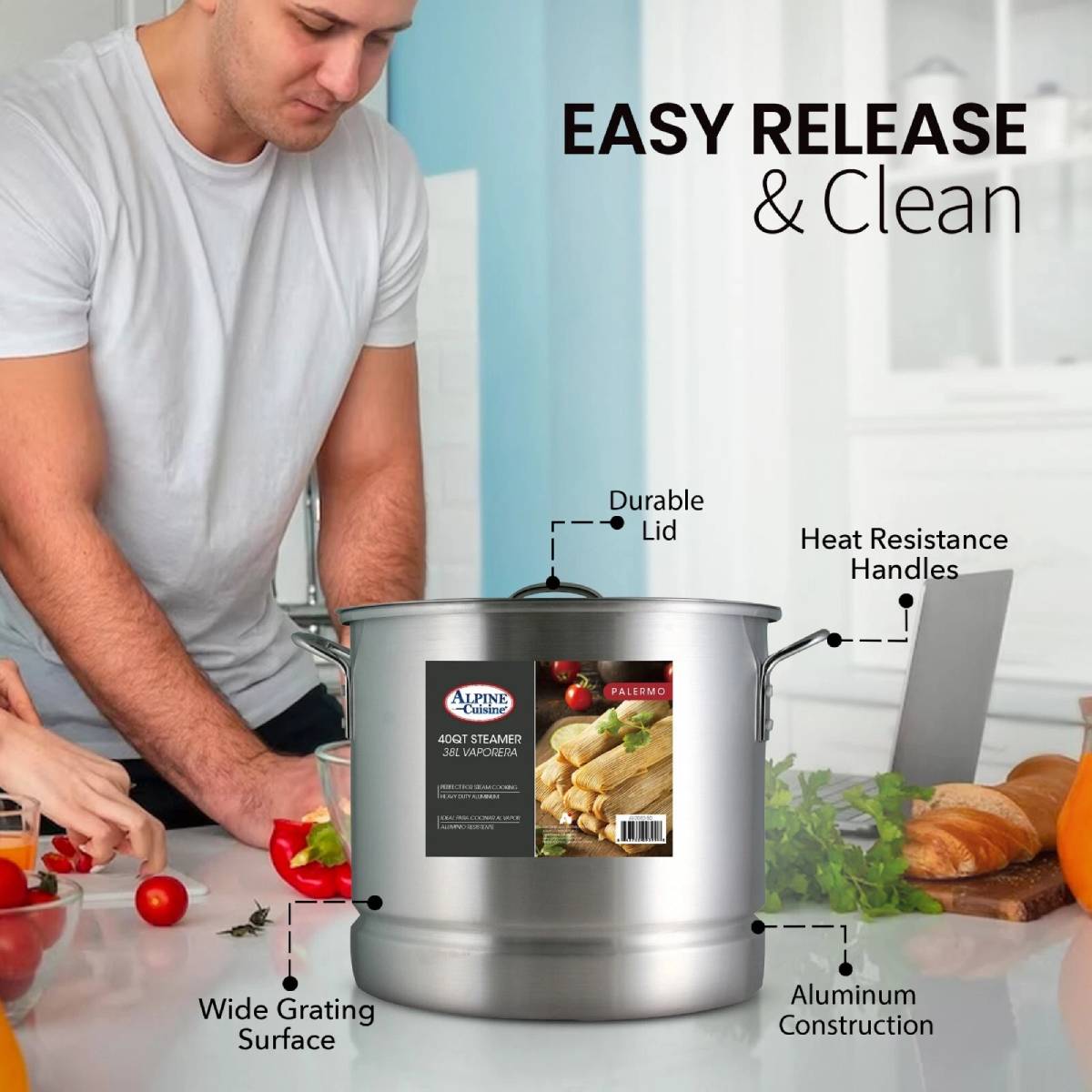 The Alpine Cuisine Steamer Stock Pot is designed for large-scale cooking, perfect for steaming tamales, seafood, vegetables, and more. Crafted from heavy-duty aluminum, it ensures even heat distribution and long-lasting durability. With its multi-tier steaming capacity, secure lid, and sturdy handles, this pot is ideal for both home kitchens and professional use. Its large capacity makes it suitable for family gatherings, parties, or catering events, offering convenience and reliability in one essential cookware piece.