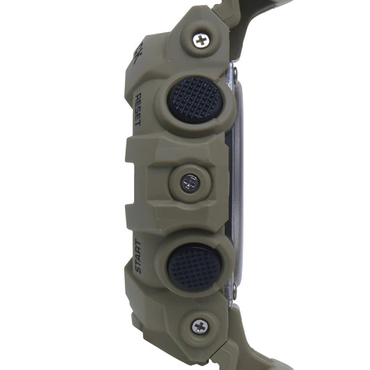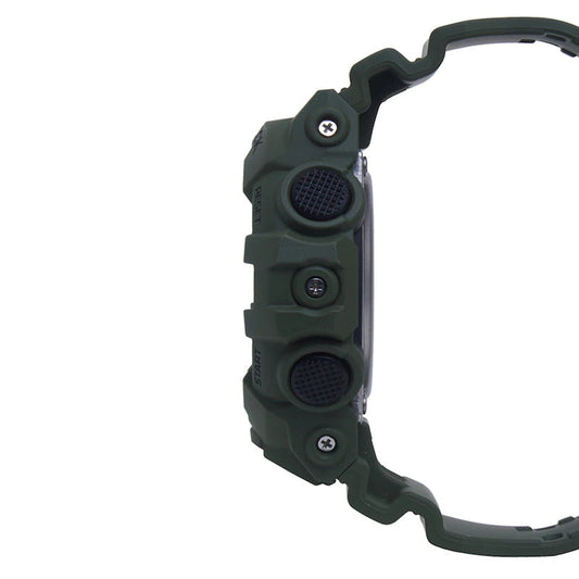 G-Shock provides this exceptionally tough watch with extreme water resistance, a large black analog-digital dial, and a versatile beige strap and case.