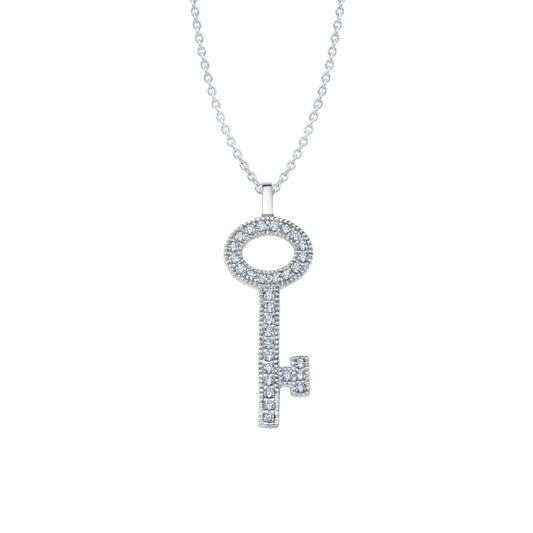 A beautiful key hangs from this 16-18" adjustable necklace crafted in .925 Precious Sterling Silver, finished in 18kt Yellow Gold, and adorned with sparkling cubic zirconia.