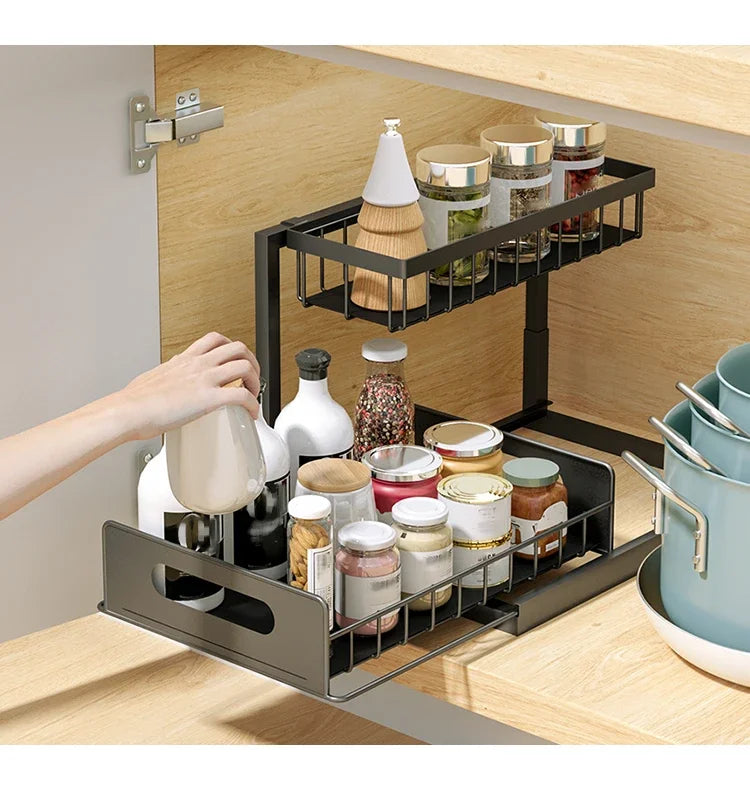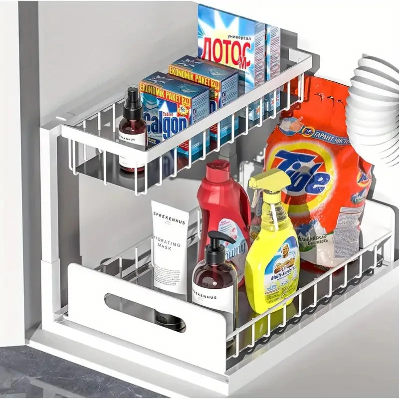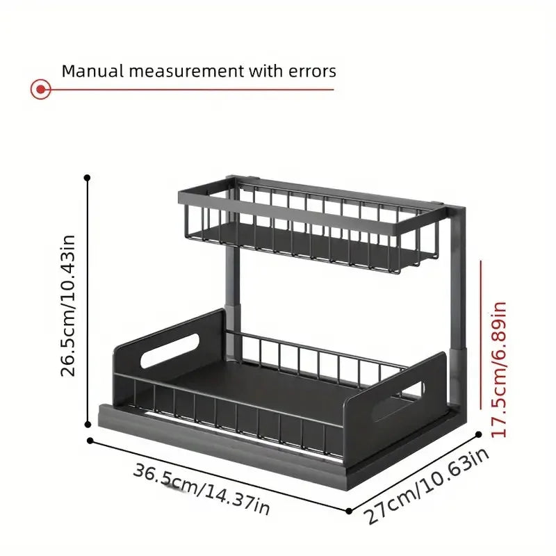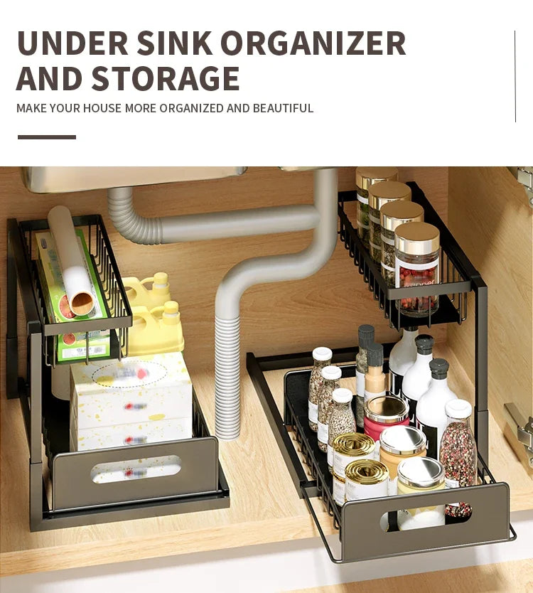 Transform your kitchen and bathroom storage with the innovative 2 Tier Under Sink Organizers with Sliding Drawer for Bathroom and Kitchen Storage. This multi-purpose organizer is designed to optimize your space efficiently, offering a perfect solution for cluttered cabinets and under-sink areas. Crafted from durable carbon steel, it can hold up to 25kg, providing stability and long-lasting use. The unique pull-out drawer ensures easy access to your essentials, making organization a breeze. Whether you need to store cleaning supplies, toiletries, or kitchen tools, this versatile shelf organizer adapts to any setting in your home. Enjoy a clean and tidy environment with this stylish and functional storage solution that combines practicality with a modern design.