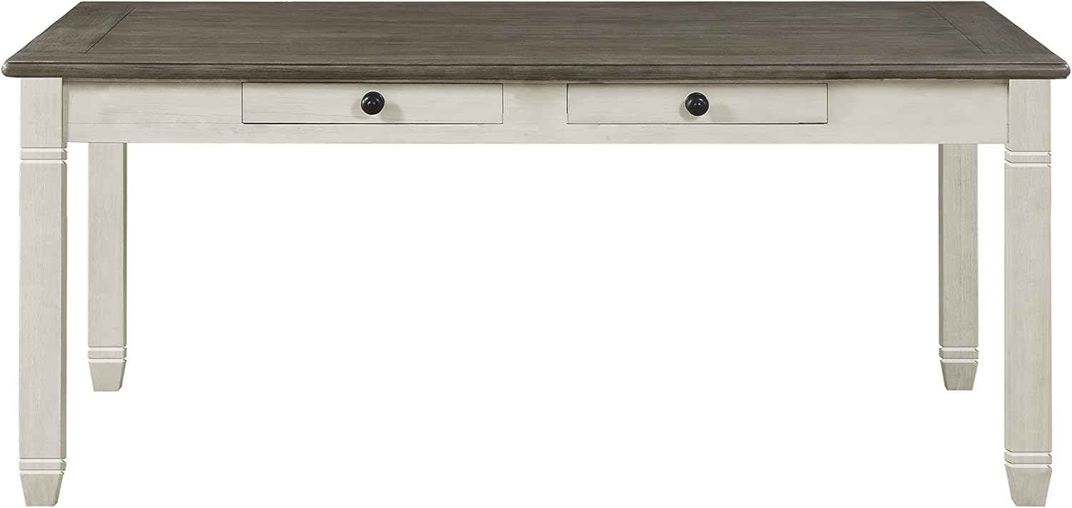 The Montana Dining Set in White/Grey features a charming two-tone design with a rustic, casual country style that’s perfect for family gatherings. Crafted from oak, rubberwood veneer, and engineered wood, this 72-inch leg table offers an antique white base paired with a warm rosy-brown top and six dovetail drawers for convenient storage. Complete with six comfortable side chairs, this inviting set blends practical functionality with cozy farmhouse appeal to enhance your dining space.