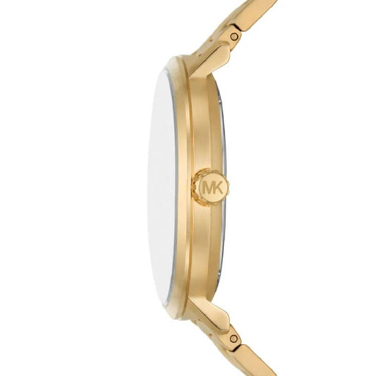 This gift set includes a 40mm watch featuring a matte white dial with gold- tone stick indexes