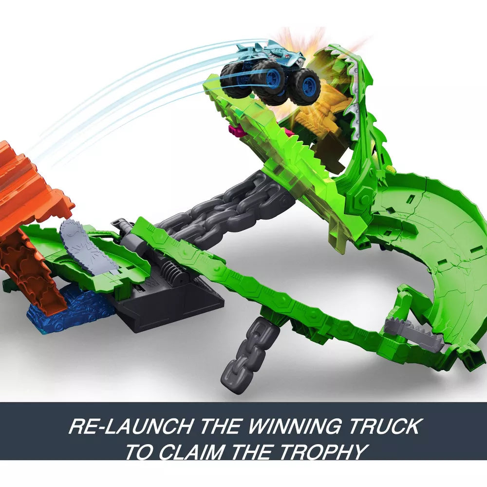Unleash epic head-to-head action with the Hot Wheels Monster Trucks Sharks vs Dinos Dragon Destruction Playset! Great Bite and Rageasaur are racing to take down the mighty cyborg dragon. Kids can load both included 1:64 scale Monster Trucks into the double slam launcher and send them speeding through the dragon’s jaws for a thrilling showdown. As they race through its insides, a chainsaw diverter randomly determines their fate. When the dragon collapses, the winning truck can be launched into its mouth to claim the ultimate victory trophy. Packed with high-speed excitement, unpredictable outcomes, and dramatic crashes, this playset brings nonstop monster mayhem to life.