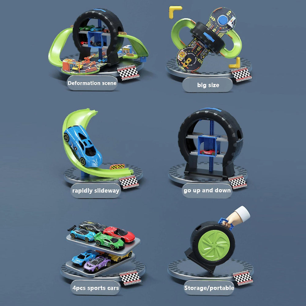 The KNP Race Track Car Tire Parking Garage Playset is the ultimate playground for young car enthusiasts! This engaging toy set is designed for children who love the thrill of racing and parking. Featuring exciting elements such as ramps, elevators, and traffic signs, this playset not only offers endless fun but also stimulates creativity and imaginative play. Kids can build their own interactive car garage and speed their mini-cars through the spiral track, enhancing their visual tracking abilities as they watch the cars zoom by. Moreover, the unique tire-shaped storage box helps foster organization skills, making cleanup a breeze. This playset is perfect for boys and girls who enjoy dynamic play experiences and want to explore their love for cars!