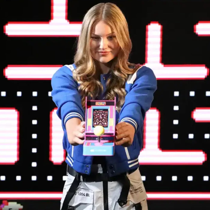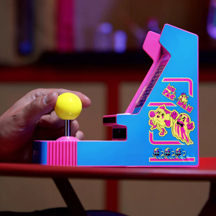 The My Arcade Pac-Man Portable Retro Arcade Joystick Player - Blue brings the nostalgic excitement of the classic arcade experience right to your hands. This portable gaming device offers the iconic Ms. Pac-Man gameplay that has captivated gamers since 1982. With vibrant artwork inspired by the original arcade cabinet, a high-resolution 3.5" full-color vertical display, and intuitive user interface, this device is perfect for reliving those thrilling chases through mazes filled with ghosts. Whether you're at home, in the office, or on the go, the My Arcade Pac-Man joystick player is your ticket to endless entertainment. Its unique features, such as high score saving and adjustable screen brightness, ensure that both new players and seasoned veterans can enjoy this timeless classic.