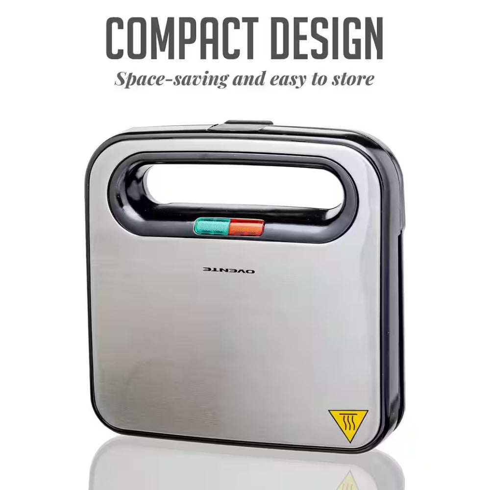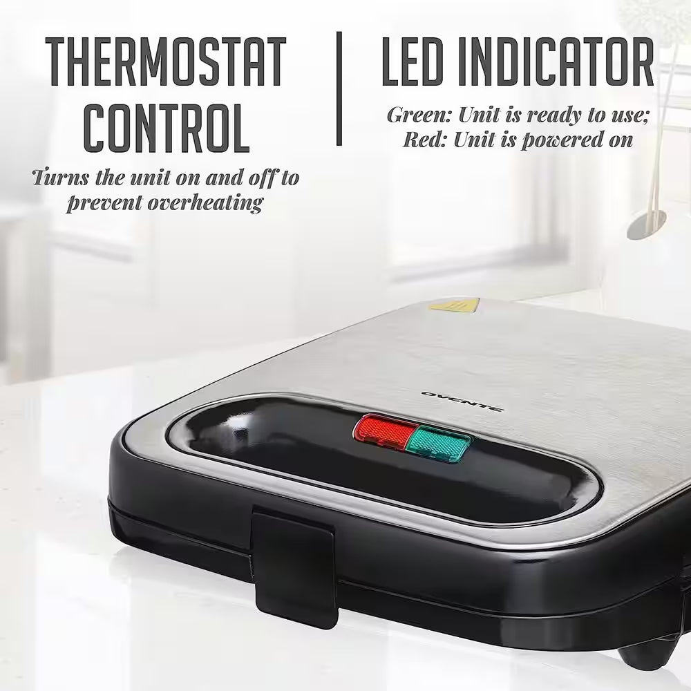 The Ovente 750-Watt Panini Press with Non-Stick Hot Plates - Black is your go-to solution for transforming ordinary sandwiches into delicious grilled masterpieces. With its powerful 750-watt heating element, this small kitchen appliance heats up quickly, allowing you to enjoy homemade meals in minutes. The durable stainless steel body ensures it withstands high temperatures without bending or warping, while also resisting rust and corrosion. Whether you're grilling meats, vegetables, or preparing a satisfying grilled cheese sandwich, this versatile panini press delivers perfectly cooked results every time. Cleanup is effortless thanks to the non-stick hot plates, which simply require a gentle wipe after use. Plus, its compact design makes it easy to store, saving valuable counter space in your kitchen.
