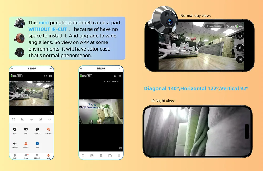 Using 3MP camera Wide View Angle:Diagonal 140 °;Horizontal 122 °;Vertical: 92°, Easily Maximize Your Home Security with a Clear View of Your Doorway.Automatic switching of day/night vision sensitivity (adjustable; distance is about 3-4 meters), TFT color LCD display, suitable for AHD images and videos. Motion detection (PIR motion sensor can automatically detect body movement and trigger push messages and videos (stored to TF card or Cloud storage need subscribe) within seconds, keeping your home safe 24 hours a day.