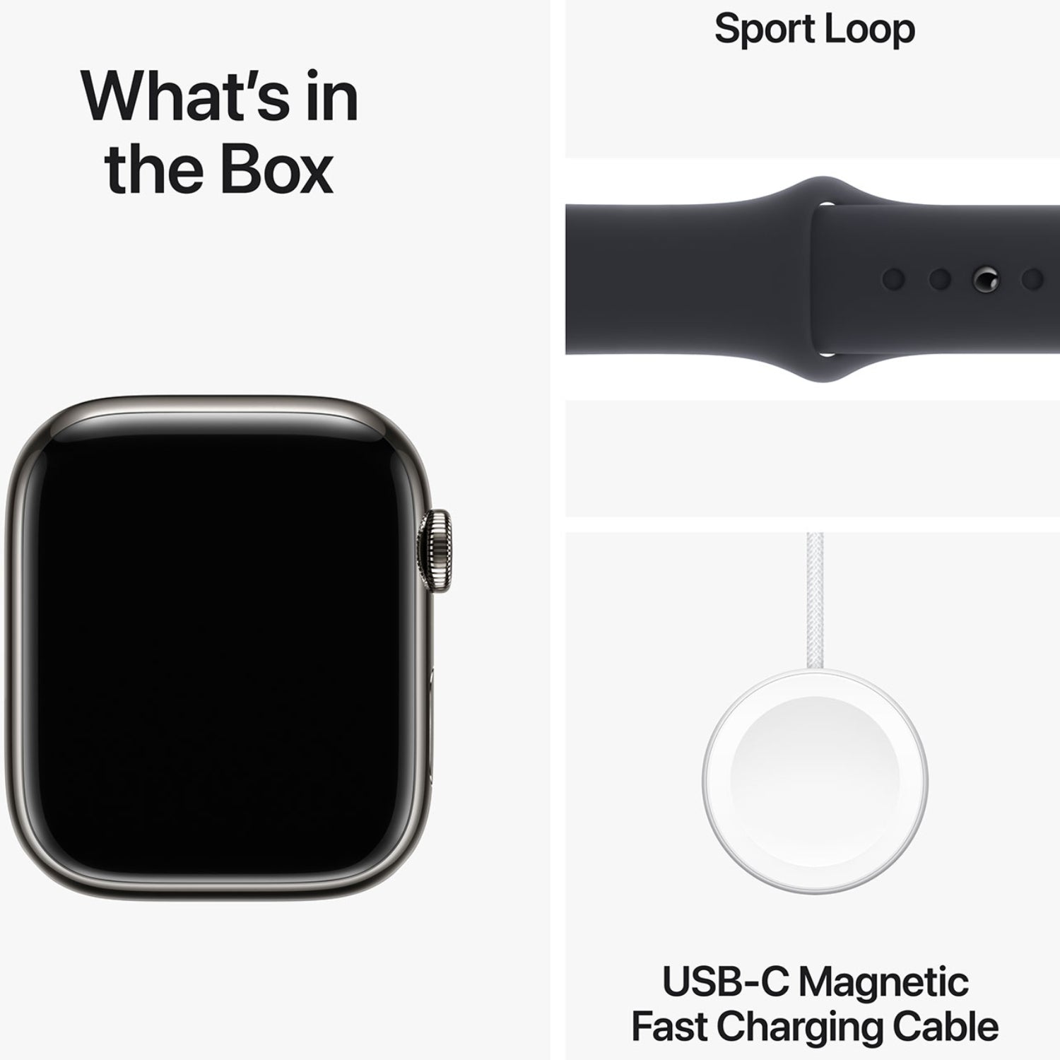 Introducing the Apple Series 9 Unisex 41mm Graphite Stainless Steel Case Smartwatch with Midnight Sport Band (S/M) - GPS + Cellular. This remarkable smartwatch seamlessly merges elegance with cutting-edge technology, offering a perfect companion for both men and women. Crafted from premium graphite stainless steel, the 41mm case not only provides a sophisticated aesthetic but also ensures durability and longevity. With its advanced GPS and Cellular features, you can stay connected even without your iPhone. The stylish Midnight Sport Band (S/M) is designed for ultimate comfort, making it ideal for daily wear and fitness activities. Whether you're tracking your workouts, receiving notifications, or making calls, the Apple Series 9 is engineered to enhance your lifestyle and keep you on top of your game.