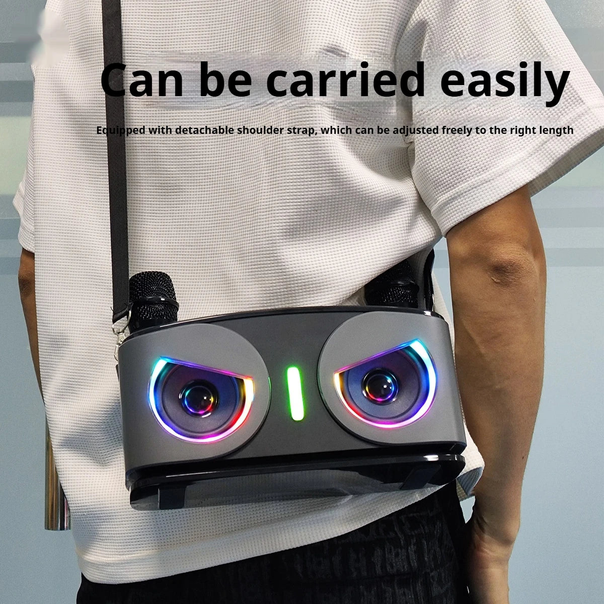 • Dual microphones for enhanced karaoke and communication.