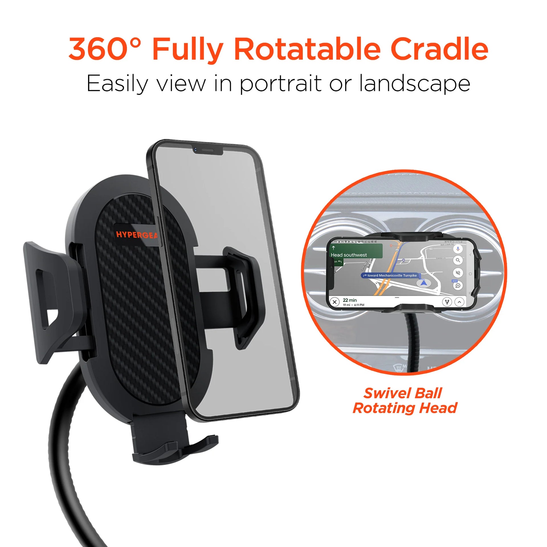 The HyperGear Cup Holder Flex Universal Phone Mount - Black is designed to provide the ultimate hands-free experience while driving. With its innovative design, this phone mount ensures that your device is securely held in place, allowing you to focus on the road ahead. The base of the mount expands to fit various cup holder sizes, making it a versatile addition to your car. Its universal phone cradle accommodates different smartphone models, and the flexible 9.5-inch gooseneck allows you to easily adjust the angle for optimal visibility. Whether you're navigating, listening to music, or taking calls, this phone mount offers convenience right at your fingertips, enhancing your driving experience.