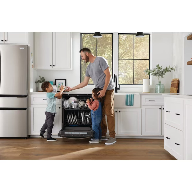 The Frigidaire Gallery GDPH4515AF 24" Built-in Dishwasher - Stainless Steel is designed to deliver a superior clean for your dishes with its innovative features. This dishwasher utilizes advanced sensor technology to assess soil levels, ensuring optimal cleaning performance every cycle. The unique OrbitClean Wash System employs multi-directional spray patterns to cover every dish from all angles, providing a thorough cleaning without wasting water. With the MaxBoost Dry system, you can say goodbye to hand drying as this dishwasher efficiently dries your dishes using a heating and fan system. Operating quietly at 52 dBA, it features a sanitize option that eliminates 99.9% of household bacteria, adjustable racks for versatile loading, and a convenient LED floor indicator light that shows you the dishwasher's status. With a quick wash cycle that cleans in just 34 minutes and an Energy Star certification for efficiency, this dishwasher is a valuable addition to any kitchen.