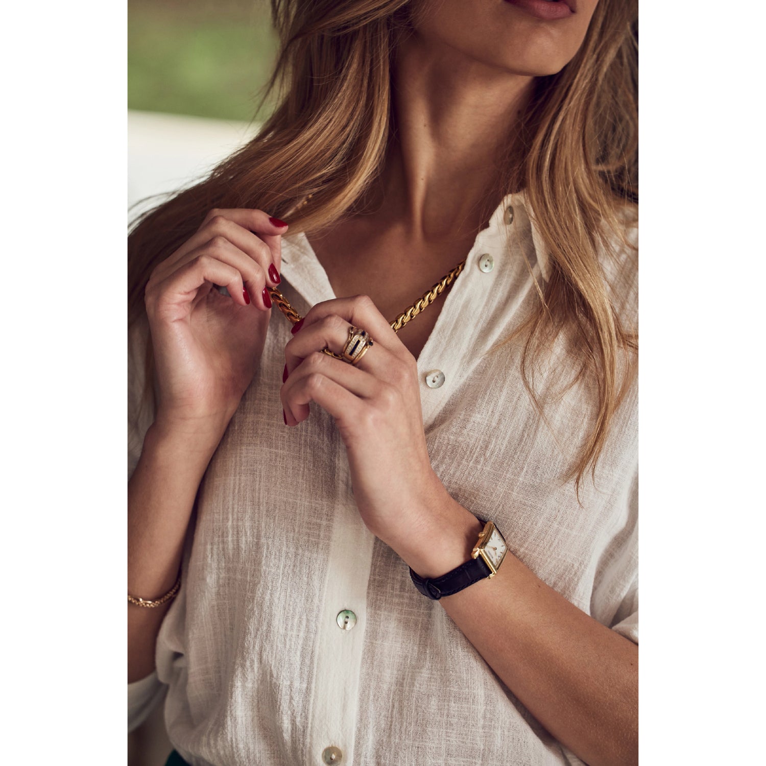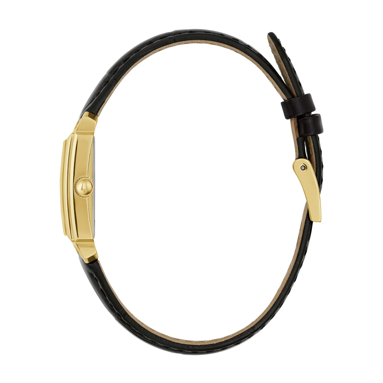 - Elegant rectangular gold-tone stainless steel case with polished finish.