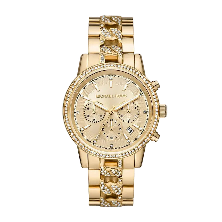 • Elegant gold-tone stainless steel case with pavé accents for luxe appeal.