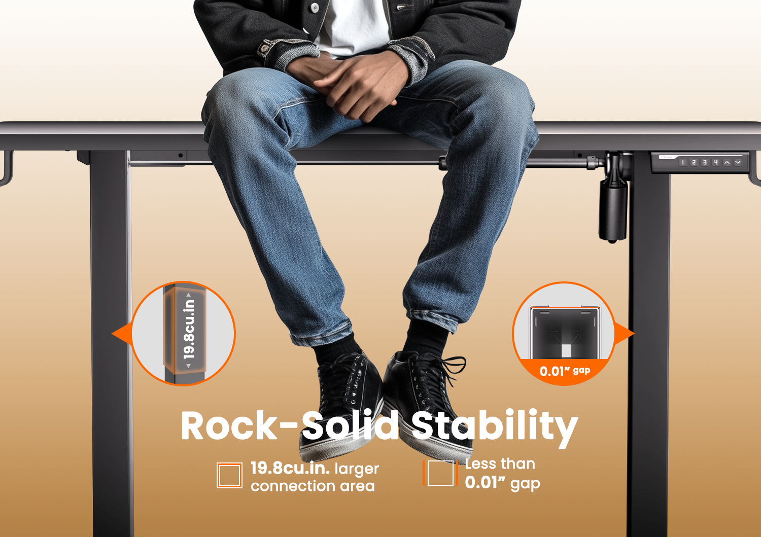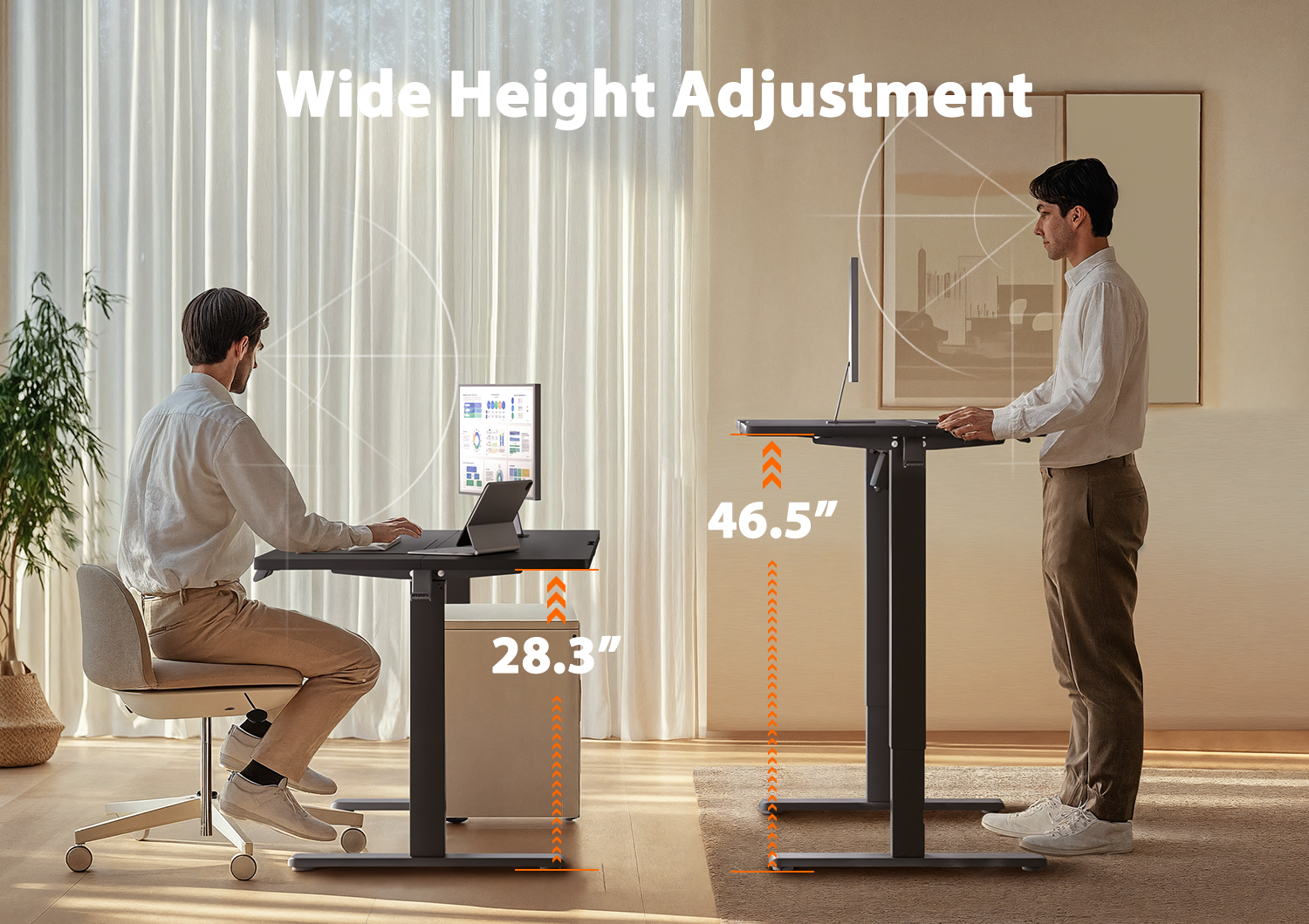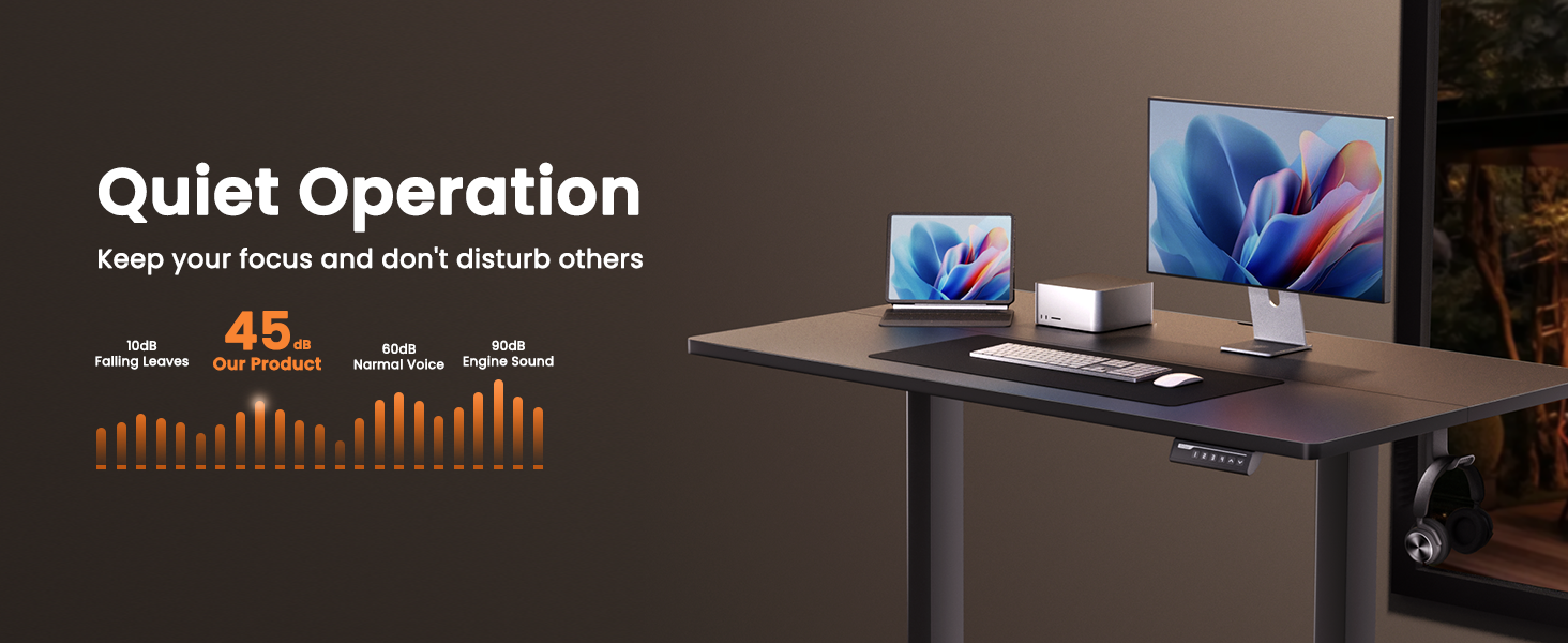 Experience exceptional stability with this electric standing desk, featuring a robust solid steel frame and aerospace-grade lifting column connectors tested over 100,000 times for lasting security—even at full height. Effortlessly adjust the height from 28.35" to 46.46" with smooth electric controls, and save up to three preferred settings for quick transitions. The upgraded motor delivers powerful, dependable lifting performance, proven through 50,000 cycles. Crafted from low-VOC materials, it meets strict US air quality standards for a healthier workspace. Assembly is straightforward with fewer steps and minimal lifting. Cable management options include grommet holes or slots for a tidy setup.