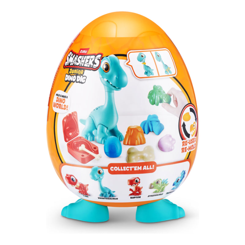 Cada huevo de excavación de dinosaurios de Smasher Junior incluye un dinosaurio para construir. ¡Descubre el T-Rex y el Brontosaurio para crear el mundo de excavación de dinosaurios definitivo!