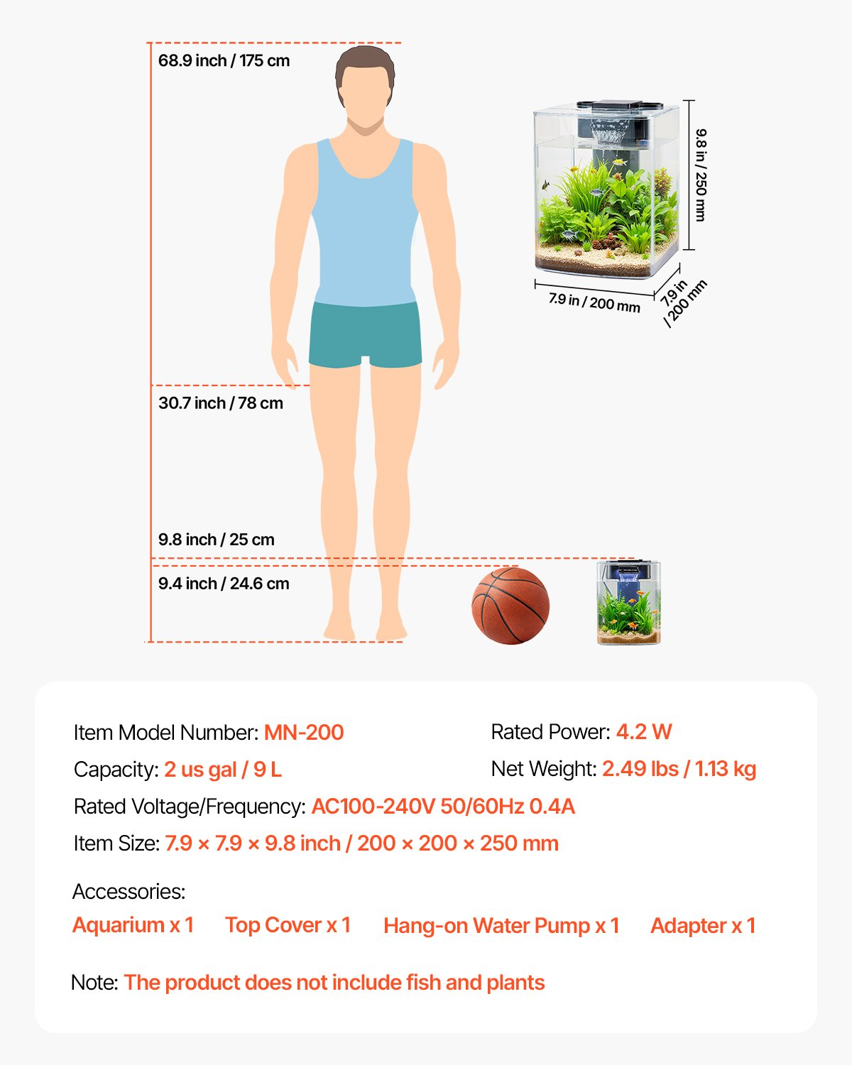 Rated Voltage/Frequency: AC100-240V 50/60Hz 0.4A,Capacity: 1.76 us gal / 6.7 L,Item Size: 7.9 x 7.9 x 9.8 inch / 200 x 200 x 250 mm,Item Model Number: MN-200,Rated Power: 3.1W,Main Material of Aquarium: GPPS,Net Weight: 2.49 lbs / 1.13 kg