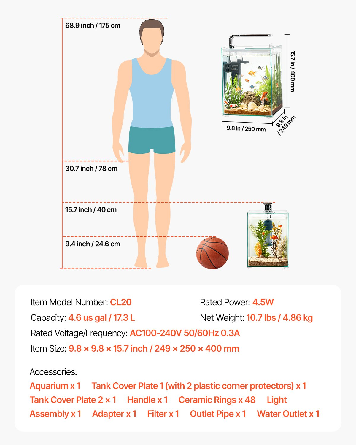 Rated Voltage/Frequency: AC100-240V 50/60Hz 0.3A,Capacity: 4.6 us gal / 17.3 L,Item Size: 9.8 x 9.8 x 15.7 inch / 249 x 250 x 400 mm,Item Model Number: CL20,Rated Power: 4.5W,Main Material of Aquarium: Glass,Net Weight: 10.7 lbs / 4.86 kg