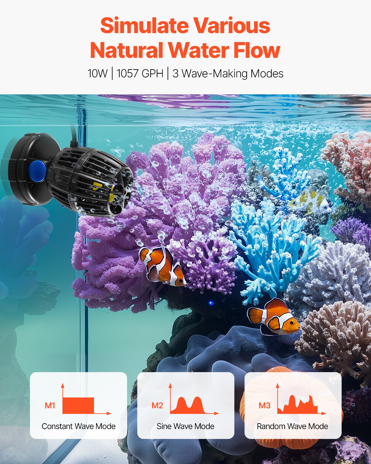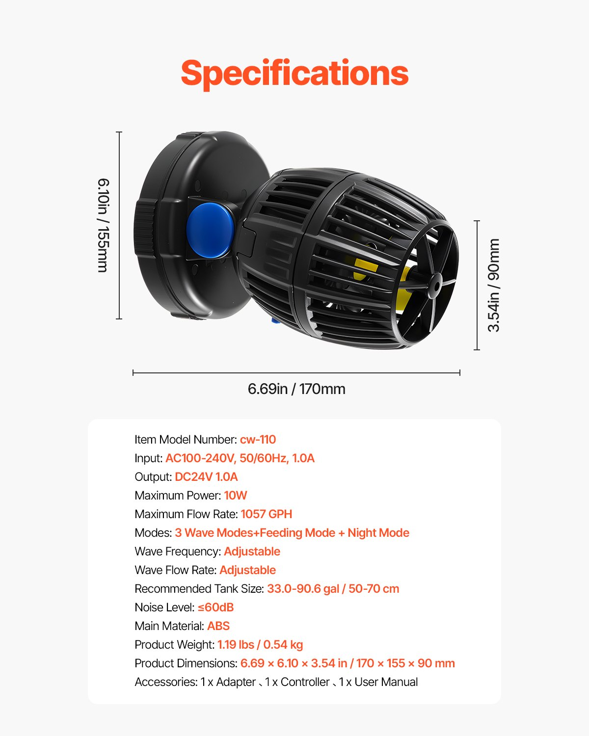 Wave Frequency: Adjustable,Wave Modes: 3 Modes,Maximum Flow Rate: 1057 GPH,Product Dimensions: 6.69 x 6.10 x 3.54 in / 170 x 155 x 90 mm,Noise Level: ≤60 dB,Input: AC100-240V, 50/60Hz, 1.0A,Maximum Power: 10W,Recommended Tank Size: 33.0-90.6 gal / 50-70 cm,Output: DC24V 1.0A,Item Model Number: CW-110,Wave Flow Rate: Adjustable,Product Weight: 1.19 lbs / 0.54 kg,Main Material: ABS